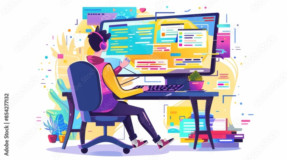 The watermark will not be included on Wall mural.: Web development - programming languages - css, html, it, ui - programmer cartoon character developing w