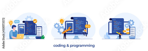 Wall mural web development. programming languages. css, html, it, ui. programmer cartoon character developing w - Wall murals Wall mural web development. programming languages. css, html, it, ui. programmer cartoon character developing w - Wall murals