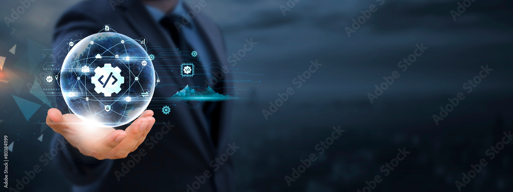 Wall mural : Web development: businessman holds global business globe with network connected to web development,