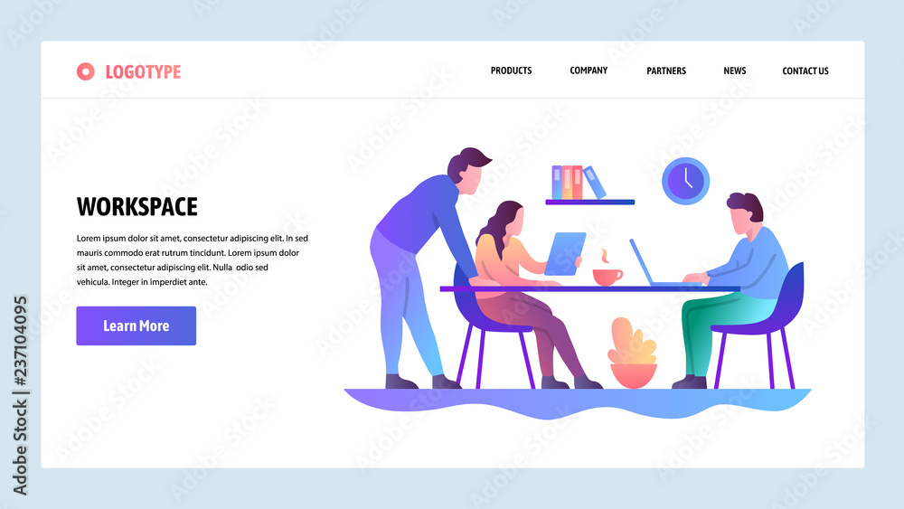 The watermark will not be included on Wall mural.: Web site onboarding screens - office meeting and coworking workplace - menu vector banner template for