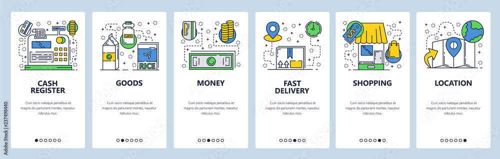 Wall mural web site onboarding screens. online shopping and money payment. menu vector banner template for webs