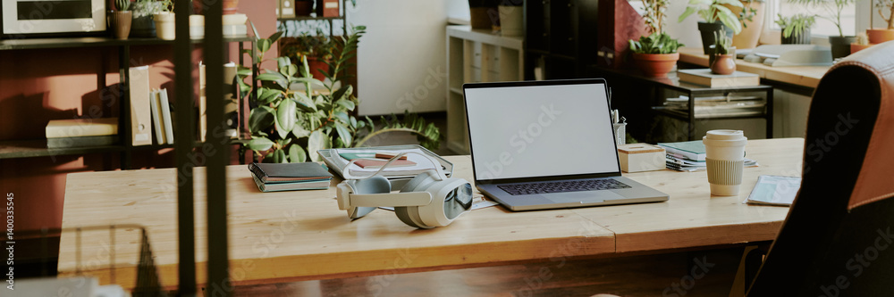 Website banner of empty programmer work zone decorated with green plants in office of it companyWall mural