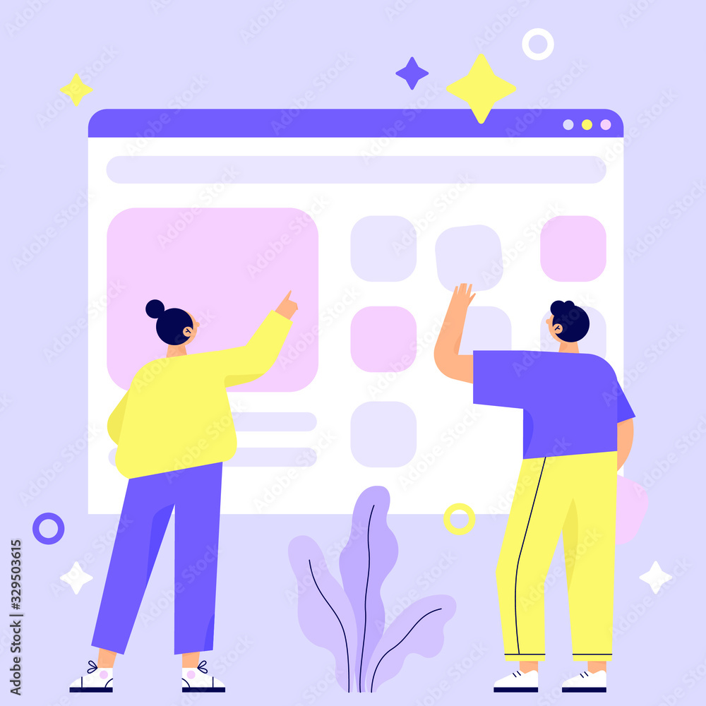 Wall mural website construction, web page building process. design for mobile and web graphics. teamwork. flat