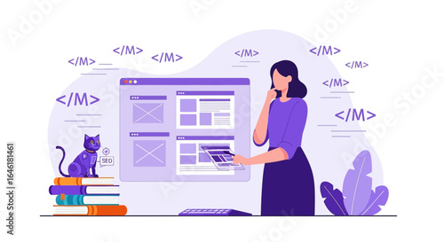 Wall mural : Website design and seo development concept with woman cat and computer interface application vector