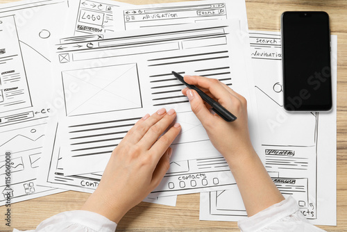 The watermark will not be included on Wall mural.: Website designer creating wireframe on paper with pen at wooden table, top view