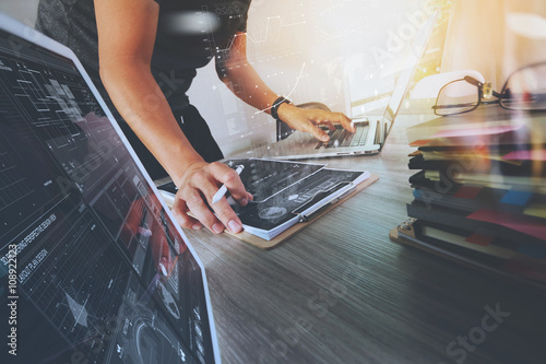 Wall mural website designer working digital tablet and computer laptop with - Wall murals Wall mural website designer working digital tablet and computer laptop with - Wall murals