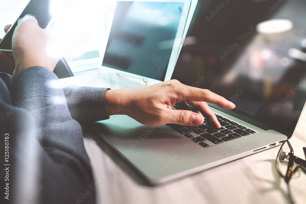 Wall mural website designer working digital tablet and computer laptop with
