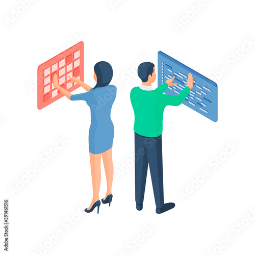 Wall mural website development and programming isometric vector illustration. male and female characters set up