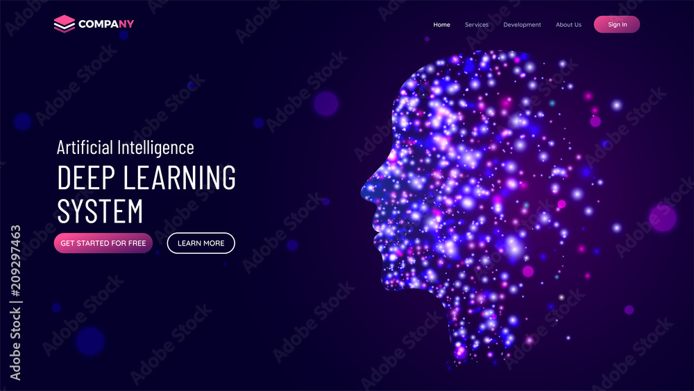 The watermark will not be included on Wall mural.: Website hero banner with illustration of human face made by glowing molecule particle for deep learn