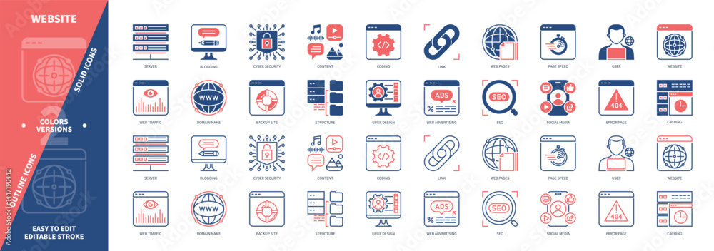 Wall mural : Website icon set - server, web traffic, structure, caching, content, cyber security, seo, coding - duo