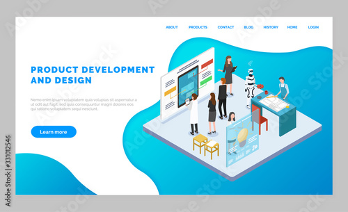 Wall mural website of product development of software and design of it. people working on engineering, manufact