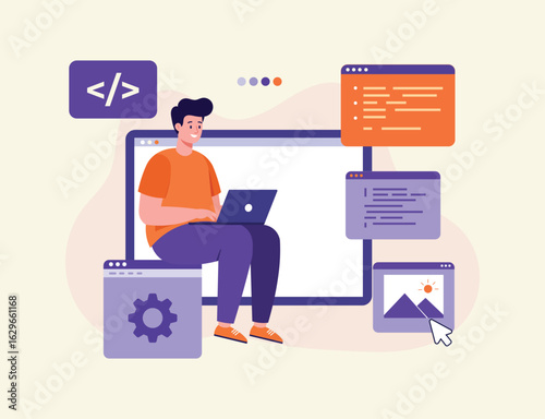 Wall mural : Website setup concept for landing page - man working as programmer, writing code using laptop, websit