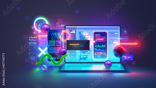 Wall mural : Website software development concept - web design site and mobile app on laptop, testing on phone - co