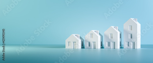 Wall mural : Which size of house can you afford? concept shot: four differently sized models of houses on a blue