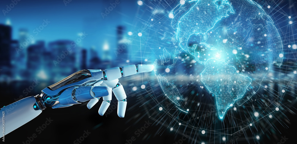 Wall mural white cyborg hand using planet earth interface 3d rendering