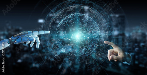 Wall mural white cyborg hand using planet earth interface 3d rendering