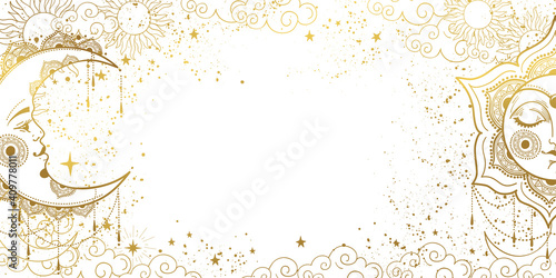 White magic background with sleeping golden sun with face and crescent moon, space pattern with copyWall mural