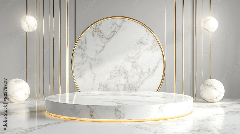 The watermark will not be included on Wall mural.: White marble and gold abstract background with generative ai - product display podium -