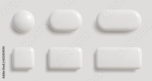 Wall mural : White monochrome 3d button set in different shapes - blank glossy round, square and rectangle badges -