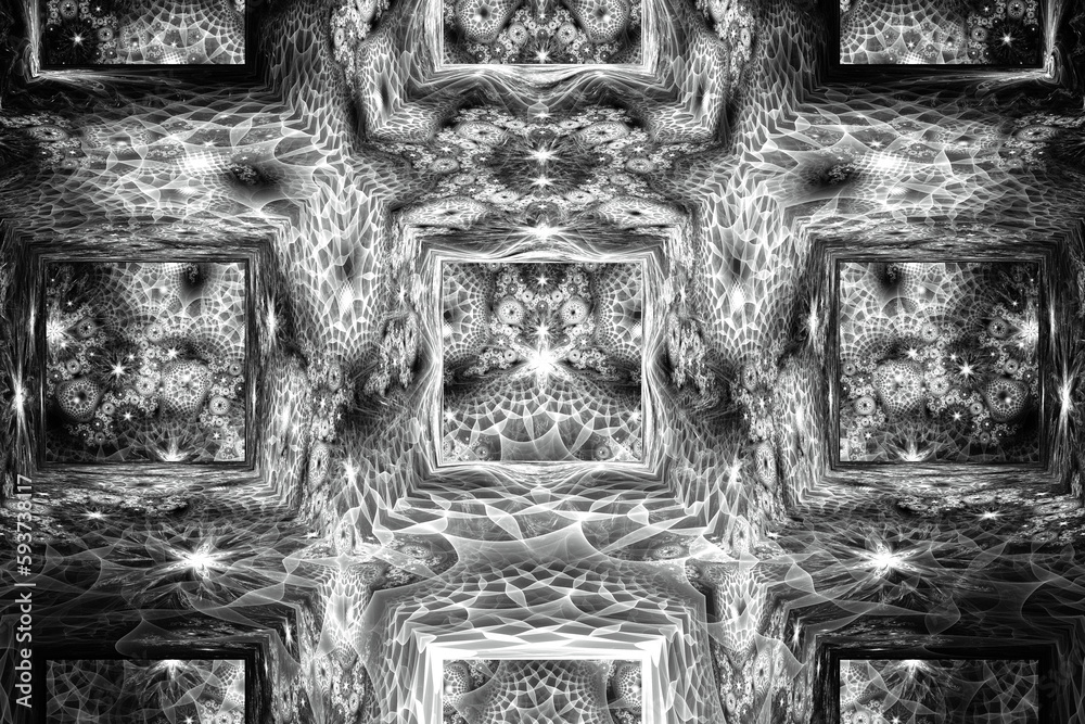 Wall mural white pattern of crooked waves and shapes with squares on a black background. abstract fractal 3d re - Wall murals Wall mural white pattern of crooked waves and shapes with squares on a black background. abstract fractal 3d re - Wall murals