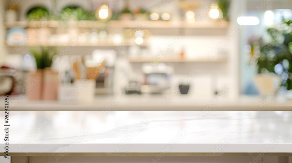 Wall mural white table and blur kitchen background empty white marble counter shelf table top over blur store s - Wall murals Wall mural white table and blur kitchen background empty white marble counter shelf table top over blur store s - Wall murals