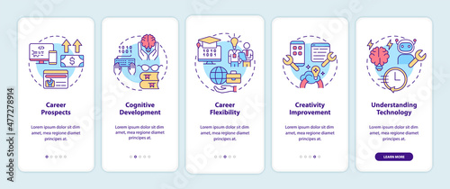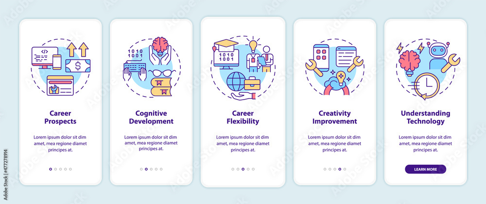 Wall mural : Why to learn to code onboarding mobile app screen - education walkthrough 5 steps graphic instruction