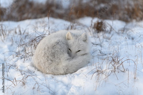 Wall mural wild arctic fox in tundra. arctic fox lying. sleeping in tundra. - Wall murals Wall mural wild arctic fox in tundra. arctic fox lying. sleeping in tundra. - Wall murals