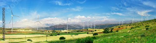 Wall mural : Wind turbine generators stand in row on green field