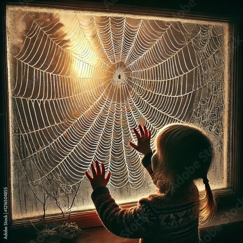 The watermark will not be included on Wall mural.: Window with spiderwebs nature s art a child noticing a spiderweb