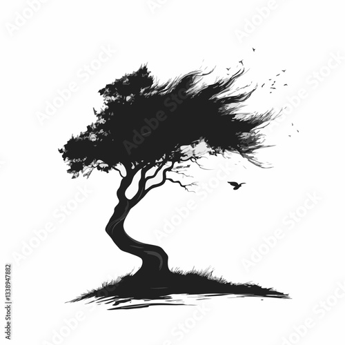 The watermark will not be included on Wall mural.: Windswept tree with birds: black tree in abstract with movement against white background