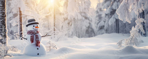 Wall mural winter background with a snowman in a winter snowy forest. new year header for a website with copy s