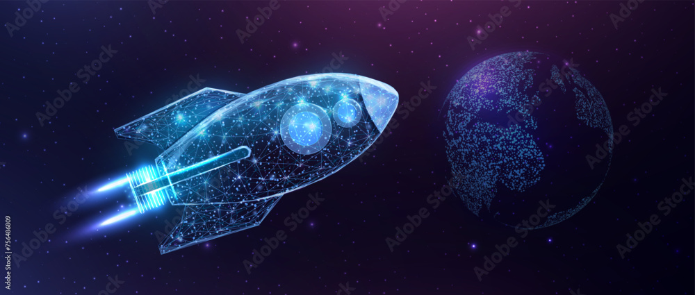 Wall mural wireframe polygonal rocket with globe map. internet technology network, business startup concept wit - Wall murals Wall mural wireframe polygonal rocket with globe map. internet technology network, business startup concept wit - Wall murals
