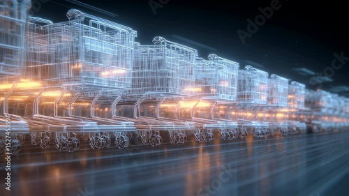 Wall mural wireframe shopping carts with glowing orange lights inside move endlessly on a dark reflective surfa