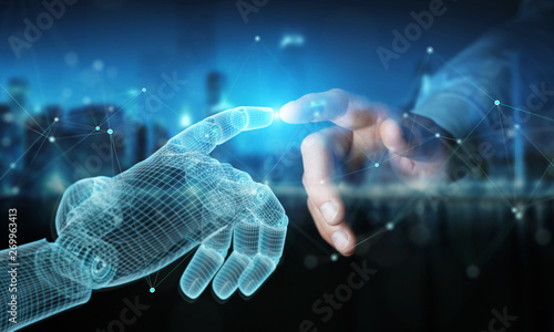 Wall mural wireframed robot hand connecting with human hand on dark 3d rendering