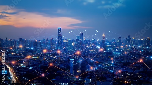 Wall mural : Wireless network and connection technology concept with abstract bangkok city background in panorama