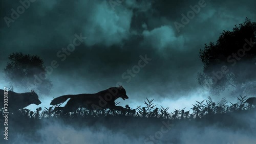 The watermark will not be included on Wall mural.: Wolves running in a lightning storm 4k loop features silhouettes of wolves running through a field o