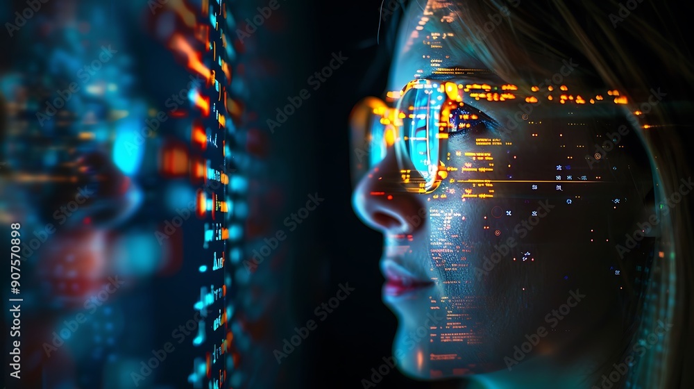 Woman's face is overlaid with digital code and a blurred background of glowing data - this visually rWall mural