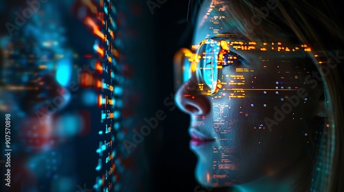 Wall mural woman's face is overlaid with digital code and a blurred background of glowing data. this visually r - Wall murals Wall mural woman's face is overlaid with digital code and a blurred background of glowing data. this visually r - Wall murals