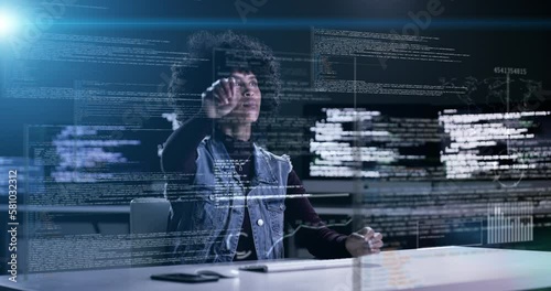 The watermark will not be included on Wall mural.: Woman, programming and dashboard hologram at night on computer or coding software application at off