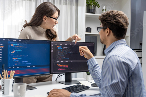 Wall mural : Woman colleague standing opposite to man programmer working on desk to discuss coding website softwa
