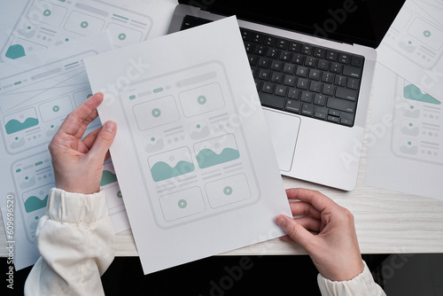The watermark will not be included on Wall mural.: Woman designer create website design wireframe - sketch, prototype, framework, layout future design p
