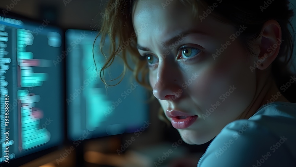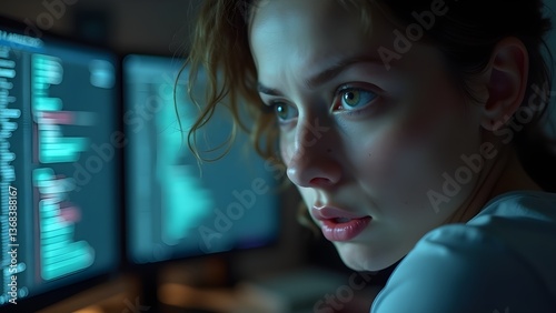 The watermark will not be included on Wall mural.: Woman focused on programming code on computer screens