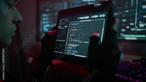 Wall mural : Woman hacker examining functionality of software on tablet