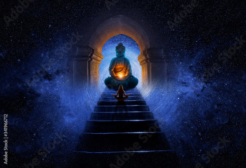 Wall mural woman in yoga pose praying to buddha - Wall murals Wall mural woman in yoga pose praying to buddha - Wall murals