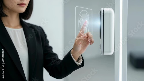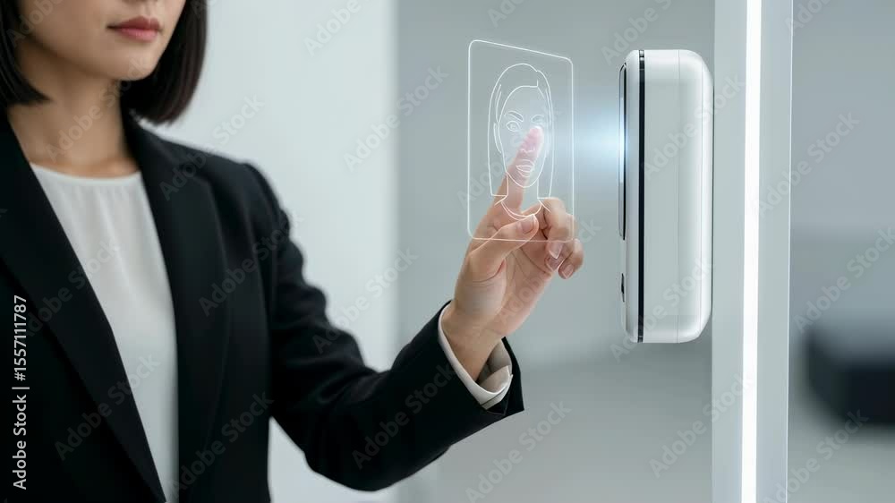 The watermark will not be included on Wall mural.: Woman interacting with biometric face recognition system - using future technology for access and sec