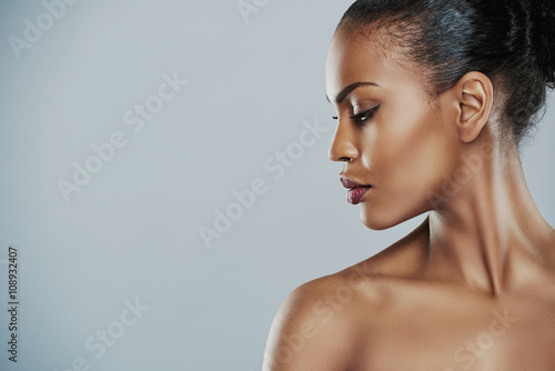 The watermark will not be included on Wall mural.: Woman looking sideways over gray background