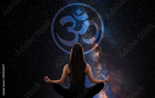 Wall mural : Woman meditating with the universe in the background with buddhist om sign