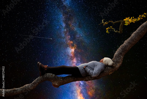 The watermark will not be included on Wall mural.: Woman on top of a branch looking at the universe