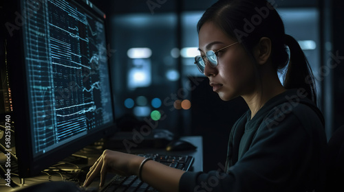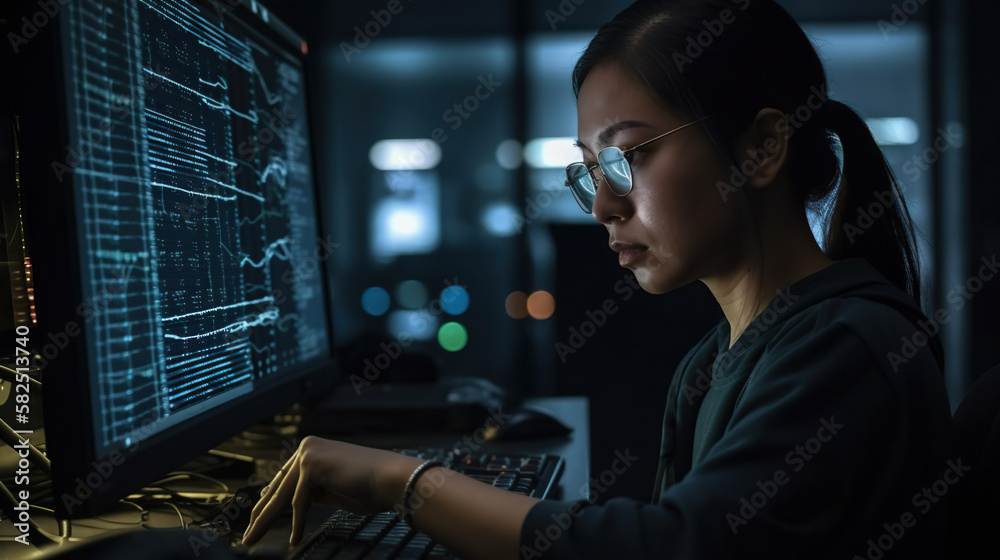 The watermark will not be included on Wall mural.: Woman programmer working on a computer in a dark room with a computer screen showing data on the scr