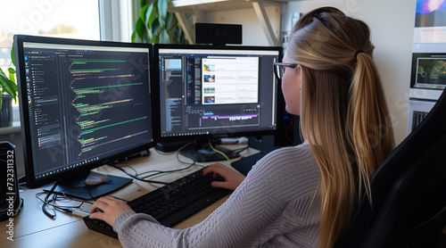 The watermark will not be included on Wall mural.: Woman programming with two monitors in office, creating saas platform for start-up